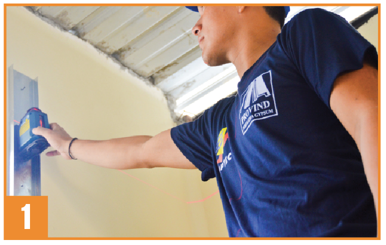 Colocar las planchas de gypsum atornillada contra la omega usando tornillos para planchas de 6 x 1” punta aguda, iniciando desde una esquina y completando toda el área, el borde debe coincidir en el centro de una omega para que continúe la siguiente plancha.