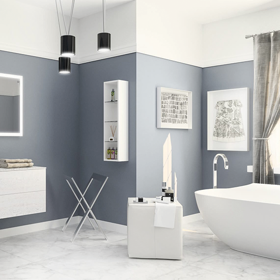 En el área de la ducha, se puede optar por un porcelanato antideslizante, mientras que fuera de la ducha se puede utilizar un piso lo más similar a los colores con los que están pintadas las paredes y que también sea antideslizante.