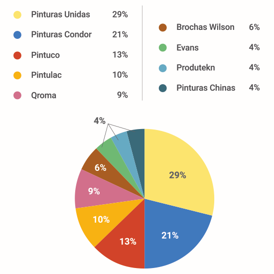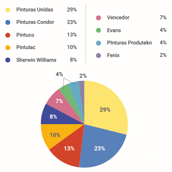 RESULTADOS: Las pinturas más vendidas son las pinturas arquitectónicas con un 25%. Pinturas Unidas se sitúa en primer lugar con el 25% como empresa proveedora, seguida por Condor con un 21%. En preferencias por parte de los compradores destacan Pinturas Unidas con un 29% y Condor con 23%. En el país se consumen más galones de pintura con un 50%, y las canecas con un 44%.
