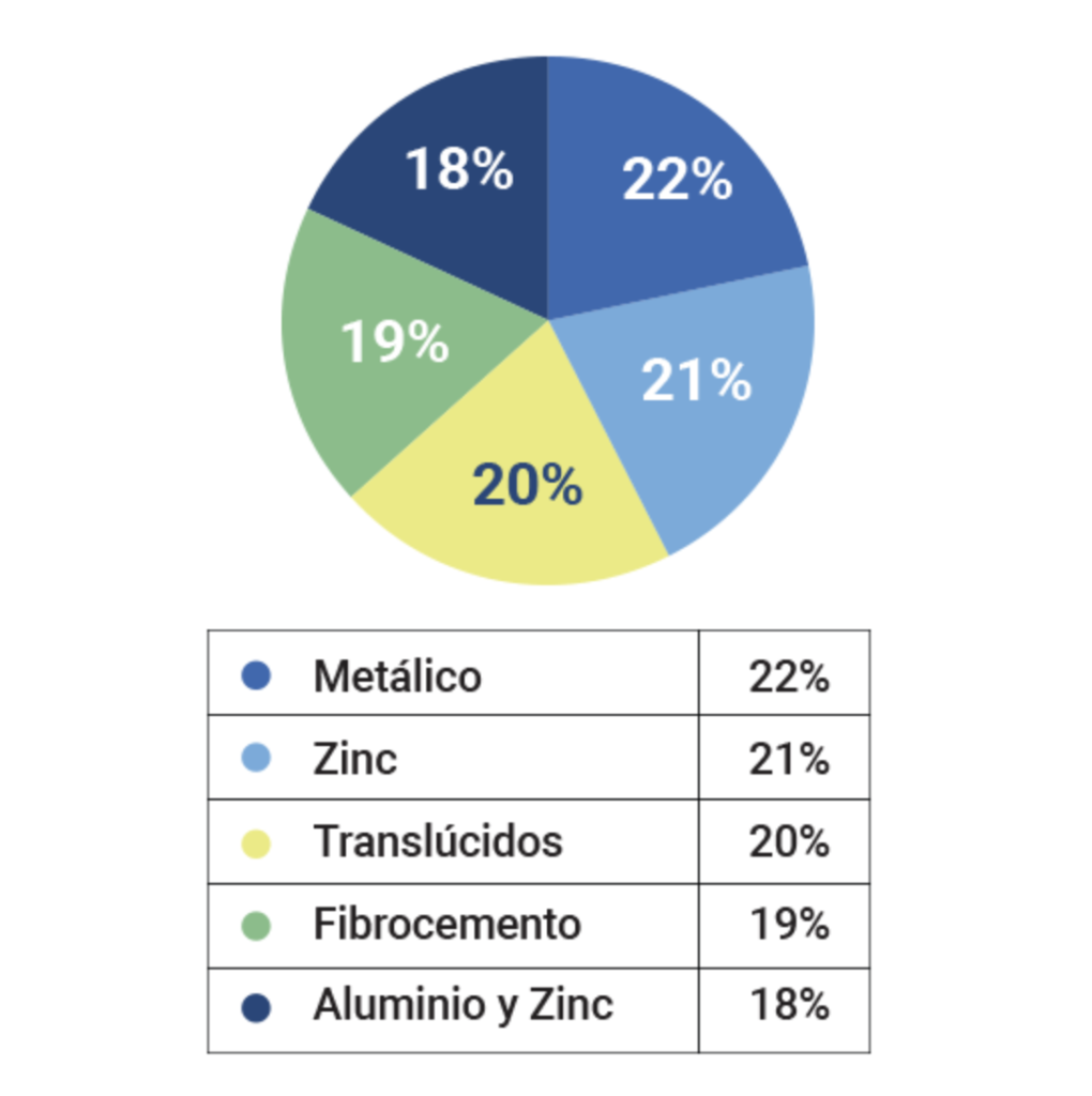• Tanto las cubiertas de aluminio y zinc, fibrocemento y translúcido ocupan los siguientes lugares con: 19%, 18% y 16% respectivamente.