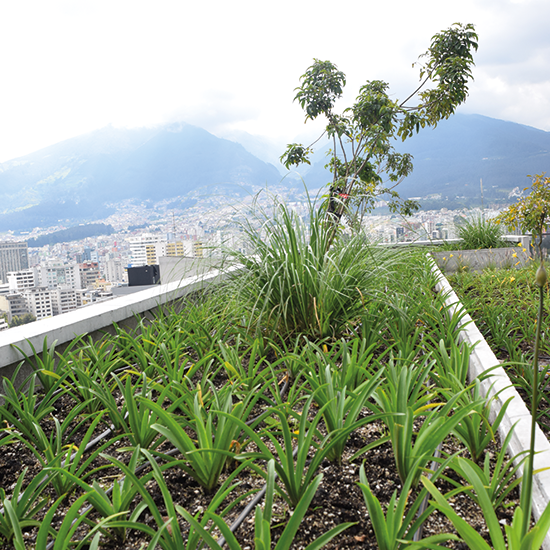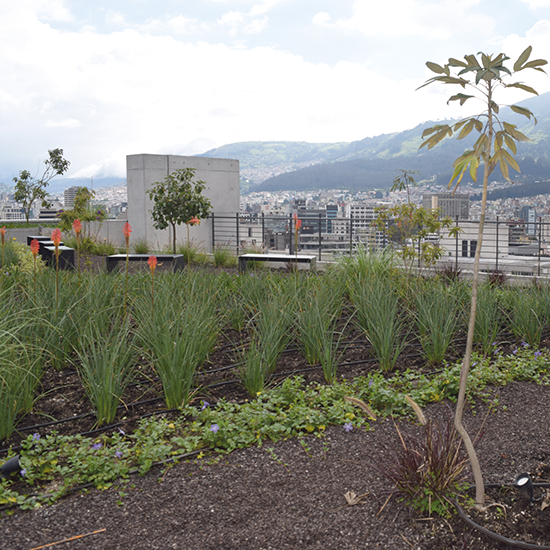 El Arq. Joan Proaño señala que “las terrazas verdes o también conocidas como techos vivos, cumplen diversos propósitos como absorber el agua lluvia, aislar térmicamente a los edificios, entre otros. En cuanto a la retención de agua lluvia, las terrazas juegan un gran papel porque previenen las inundaciones. Según el tipo utilizado y el espesor del medio del cultivo puede reducirse en un 50-90% de líquidos, ya que gran parte del agua regresa al ciclo hidrológico natural por evapo–transpiración de la capa vegetal. El exceso se filtra y drena paulatinamente, reduciendo la sobrecarga del sistema de alcantarillado urbano que al final, podría resultar en un ahorro fiscal significativos”.