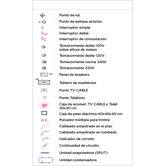 Circuitos de tomacorriente: Deben contener las salidas perfectamente definidas y ubicadas, esto es empotradas en pared, a una altura referencial de 40 centímetros sobre el piso acabado; empotradas sobre mesones a una altura referencial de 15 centímetros sobre el nivel del mesón acabado.