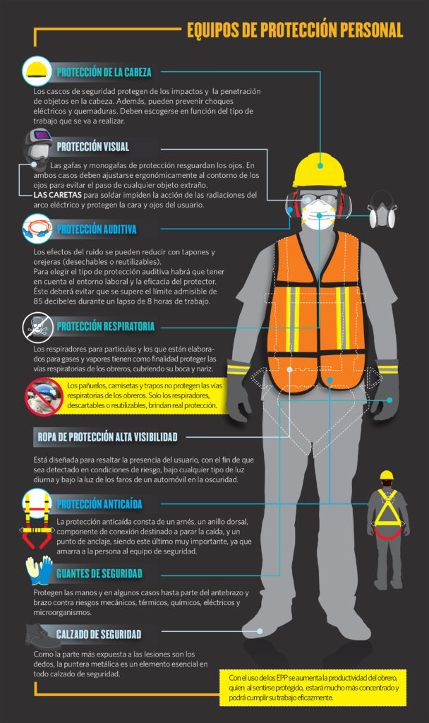 Cabe recordar que a demás de la ropa de trabajo, hay algunos elementos de protección, tales como: casco, guantes, botas, chaleco, gafas, etc.