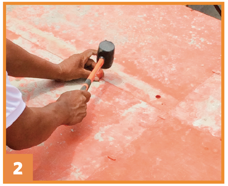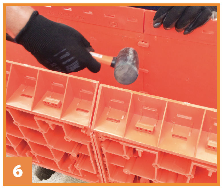Mediante la esquina externa conecte paneles EH perpendicularmente con las cuñas cortas T, para ello utilice un martillo.