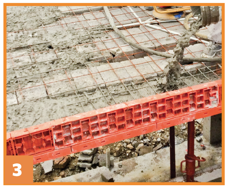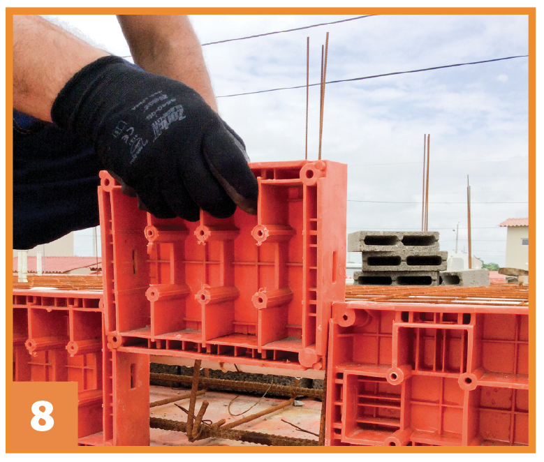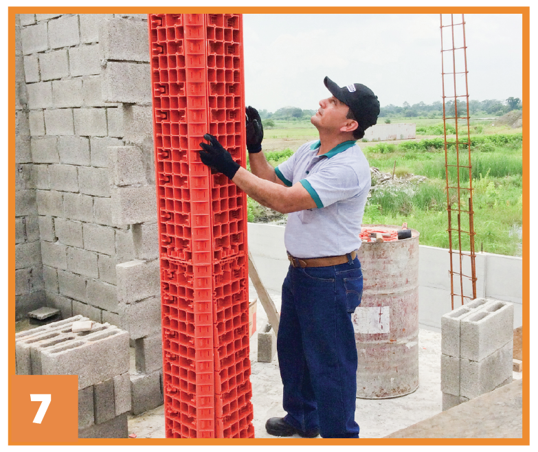 Coloque el encofrado (3 caras) en el lugar donde se fundirá la columna (estructura de hierro), coloque la 4ta tapa de encofrado mediante las cuñas T/L y vierta el hormigón. El acabado será liso.