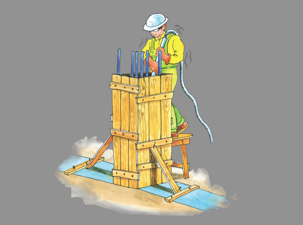 PASO 6: Compactar la mezcla en el encofrado usando un vibrador verticalmente, evitando tocar el acero de refuerzo de la columna o el encofrado. Curar el elemento por 7 días mínimo.