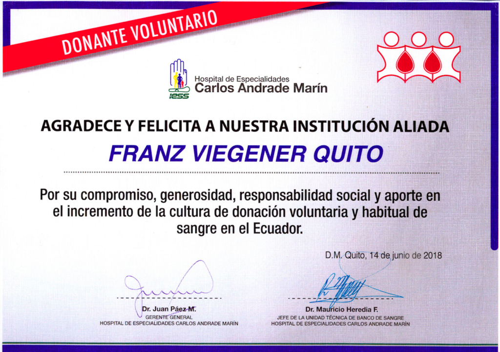 Sensibles ante las problemáticas sociales el pasado 14 de junio del 2018, Día Mundial del Donante de Sangre, la Dra. Paola Montenegro, en representación del personal de Donantes Voluntarios de FV, recibió una placa de reconocimiento por parte de los representantes del Banco de Sangre del Hospital de Especialidades Carlos Andrade Marín.