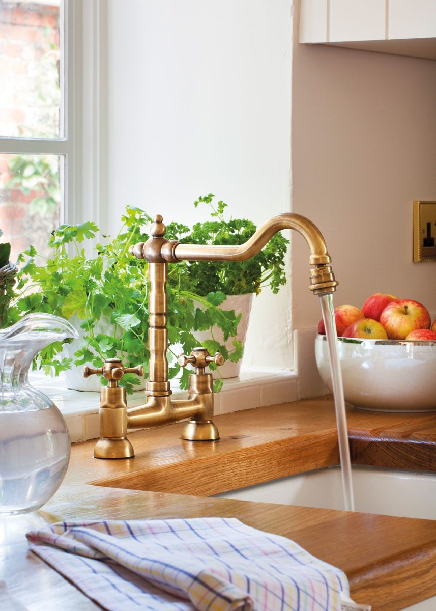 Las griferías doradas, bronce, satinadas o con una aplicación de cerámica blanca son las más recomendadas.