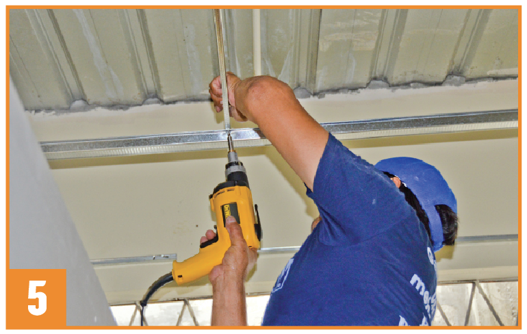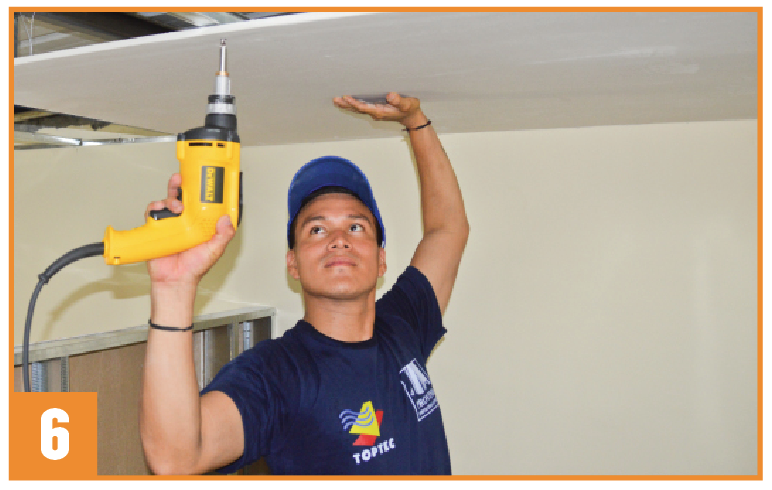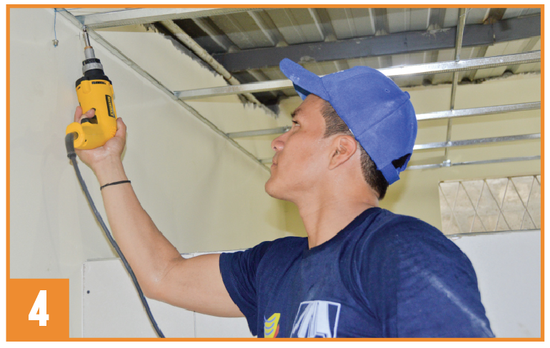 Colocar las planchas de gypsum atornillada contra la omega usando tornillos para planchas de 6 x 1” punta aguda, iniciando desde una esquina y completando toda el área, el borde debe coincidir en el centro de una omega para que continúe la siguiente plancha.