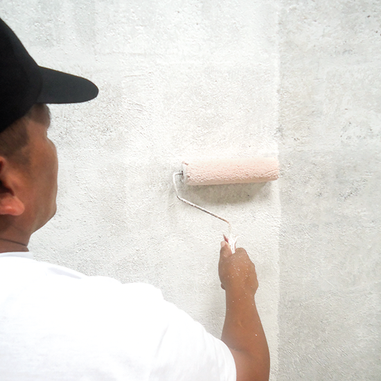 Para aplicar el fondo acrílico en la pared podemos hacer uso de una brocha o un rodillo. Asegúrese de cubrir todas las juntas así como toda la superficie de la pared. Se necesitan aplicar dos capas de fondo para conseguir la mejor adherencia y durabilidad. La primera capa debe diluirse normalmente en una proporción de 1 a 1 con agua potable y limpia. Ésta servirá como imprimante para llenar todos los poros del hormigón. En la segunda capa aplicaremos el material sin disolución tal como viene en el envase.