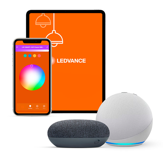 La línea SMART + WIFI para uso residencial consta de lámparas, luminarias y tiras LED inteligentes, que le permitirán tener el control total de su iluminación ambiental. Encender, apagar, configurar la iluminación, el color y la intensidad de luz. Todo esto mediante la aplicación LEDVANCE SMART + WiFi, a través de su teléfono inteligente o tableta, incluso mediante comando de voz.