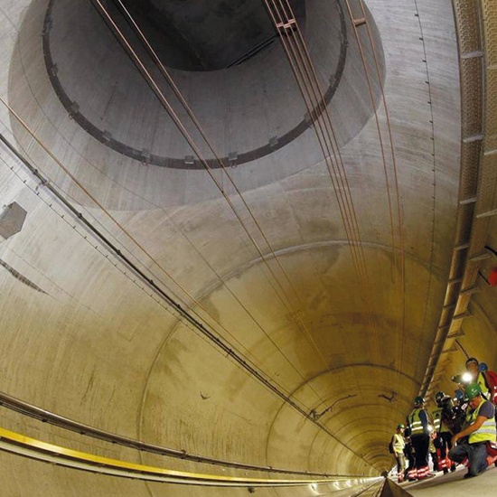 Una decisión importante durante la fase de planificación fue la de construir el túnel con un revestimiento interior continuo de hormigón preparado in situ. Este recubrimiento disminuye la resistencia del aire, lo que aminora la cantidad de calor emitida por los trenes. Además, mejora la circulación natural del aire en el túnel, reduce la humedad y limita la filtración de aguas subterráneas. Mientras se avanzó con la perforación en la cabeza de la galería, se inició en paralelo el proceso de construcción del túnel. En breve, el túnel excavado y debidamente asegurado recibió el recubrimiento interior definitivo, que es necesario para mejorar la aerodinámica para el paso de los trenes a alta velocidad y, sobre todo, para garantizar una buena conservación de la infraestructura en las condiciones especiales existentes: alta temperatura y de humedad.