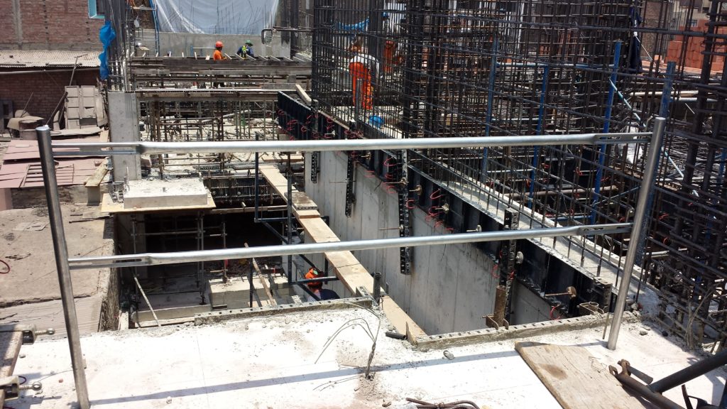 • Barandas reglamentarias en perímetros de losas y huecos interiores (no cuerdas ni cintas de peligro).