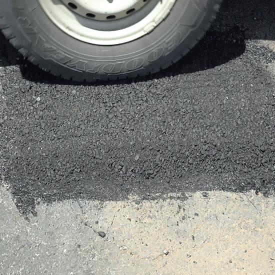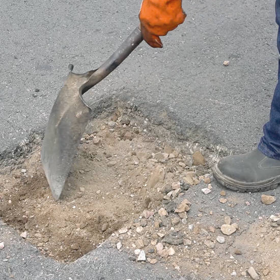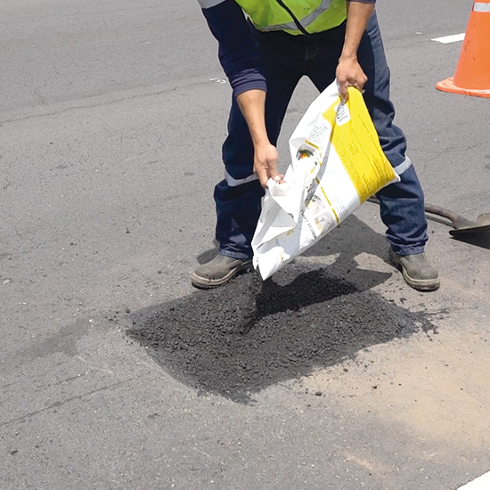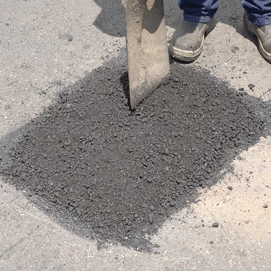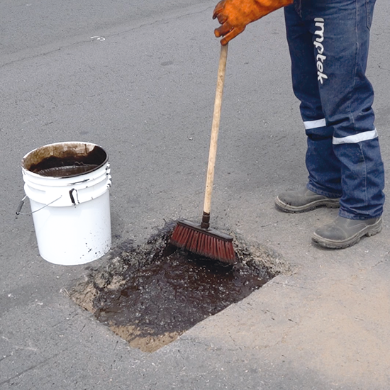 4.- Vierta el BITUMIX sobre el bache, rellenando y distribuyéndolo en toda el área con un rastrillo o una pala, asegurándose de que el producto aplicado exceda entre 1 o 2 centímetros de la altura por encima del nivel del pavimento.