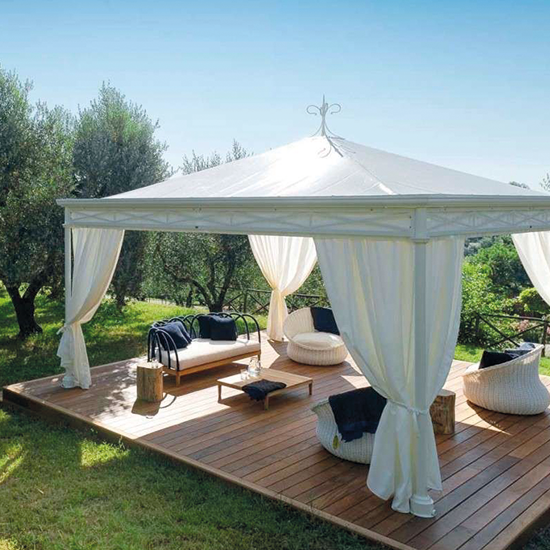 Si además de una pérgola para colocar muebles de exterior quieres estar más resguardado, puedes escoger pérgolas con sistema de cierre. En este sentido hay pérgolas con sistema de cierre que poseen cortinas y tela en la parte superior. Son una opción de suma elegancia y confort para sus usuarios.