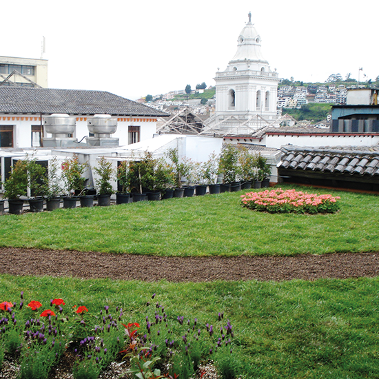 Otra de las soluciones eco-amigables que se han considerado son las famosas terrazas vivas (cubiertas verdes), las cuales se han visto implementadas ya desde un par de años atrás en proyectos inmobiliarios. Aparte de ser un espacio de distracción, la constructora PROAÑO|PROAÑO ha visto la funcionalidad que las mismas brindan a sus edificaciones y; como se mencionó anteriormente la tierra absorbe la mayoría de agua de lluvia que cae mientras que un porcentaje menor se va por las tuberías. Estas mismas acciones las ha tomado el Municipio de Quito sobre las estaciones de Trole en la ciudad, las cuales aparte de tener un diseño modernizado y amplio, ahora son también eco–amigables.