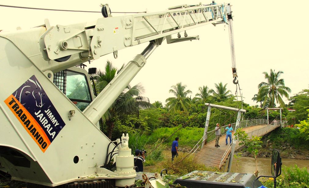 Bajo la coordinación del director de Obras Públicas del Gobierno Provincial, Jimmy García, llegaron varias maquinarias entre ellas, una grúa, cinco volquetas cargadas de piedra escollera y una excavadora para dar inicio a la reparación del puente peatonal entre recintos Nueva Era y Vuelta Larga.