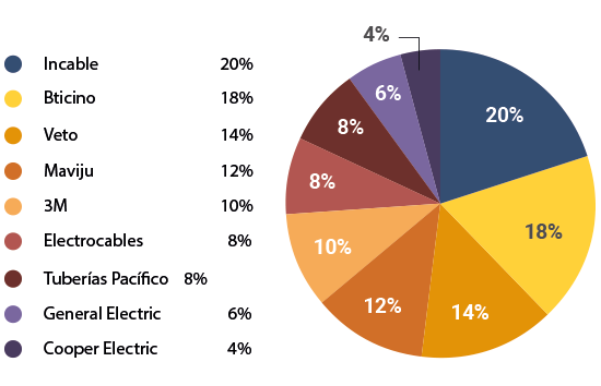 La encuesta da como resultado que los productos de línea eléctrica más solicitados son los tomacorrientes, seguidos de los cables e interruptores. En el caso de los productos de iluminación los que más vendidos son los focos, lámparas y luminarias. Entre las marcas de mayor preferencia en material eléctrico e iluminación se encuentran: Incable, Bticino, Veto, 3M, Electrocables, Sylvania, Ledvance, Maviju, Marriott, entre otras.