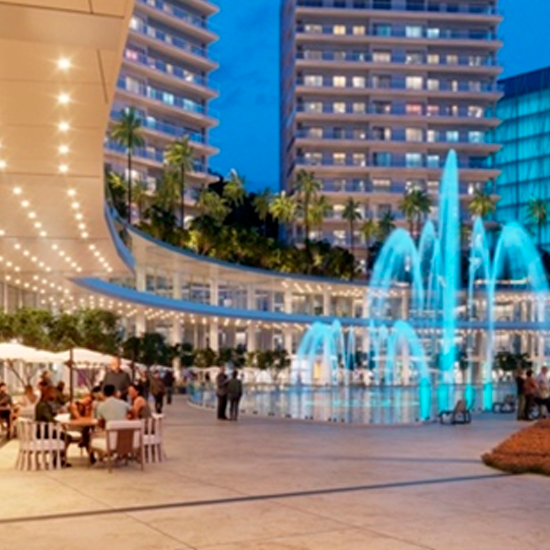 La plaza comercial es el corazón del proyecto, llamado Acqua Shops, centro de encuentro para familias, amigos, visitantes y negocios. Es un lugar lleno de luz, agua, música, la mejor gastronomía y comercio de la ciudad. Un lugar vibrante, se destacan sus imponentes y mágicas fuentes, las cuales se convertirán en un ícono de la ciudad.
