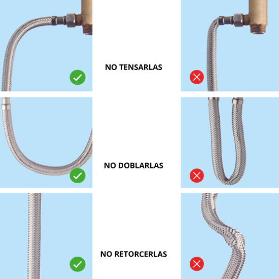 - Mayor riesgo de fugas o roturas, menor vida útil y posible mal funcionamiento de los productos, ya que la manguera flexible puede quedar mal instalada, tensa o estrangulada causando problemas al poco tiempo de ser instaladas.