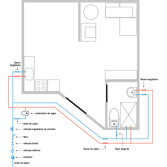 Es recomendable que cada cuarto de baño o cocina tenga una llave angular para la alimentación de cada aparato sanitario. Estas llaves deben instalarse a la salida de la tubería de agua (sea agua fría o caliente) y previo a la instalación de la grifería de lavabo/cocina o del inodoro.