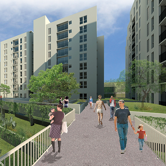 Sobre el contexto urbano, la escala de intervención, tiene que estar en relación a la superficie de las viviendas y el número de familias, lo cual delimita una zona dentro de la ciudad, en la cual deben ubicarse equipamientos de salud, educación. Además en su movilidad, conectarse a la red de vías en la ciudad.