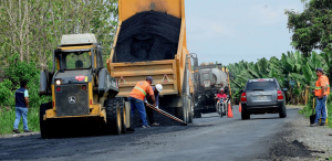 Unos 500 m3 de asfalto son colocados en las áreas dañadas de la vía El Empalme – La Guayas para que más de 20 mil usuarios que la utilizan, en especial agricultores, puedan transitar sin problemas, al igual que lo hace con la carretera Roberto Astudillo-Venecia de Chimbo.